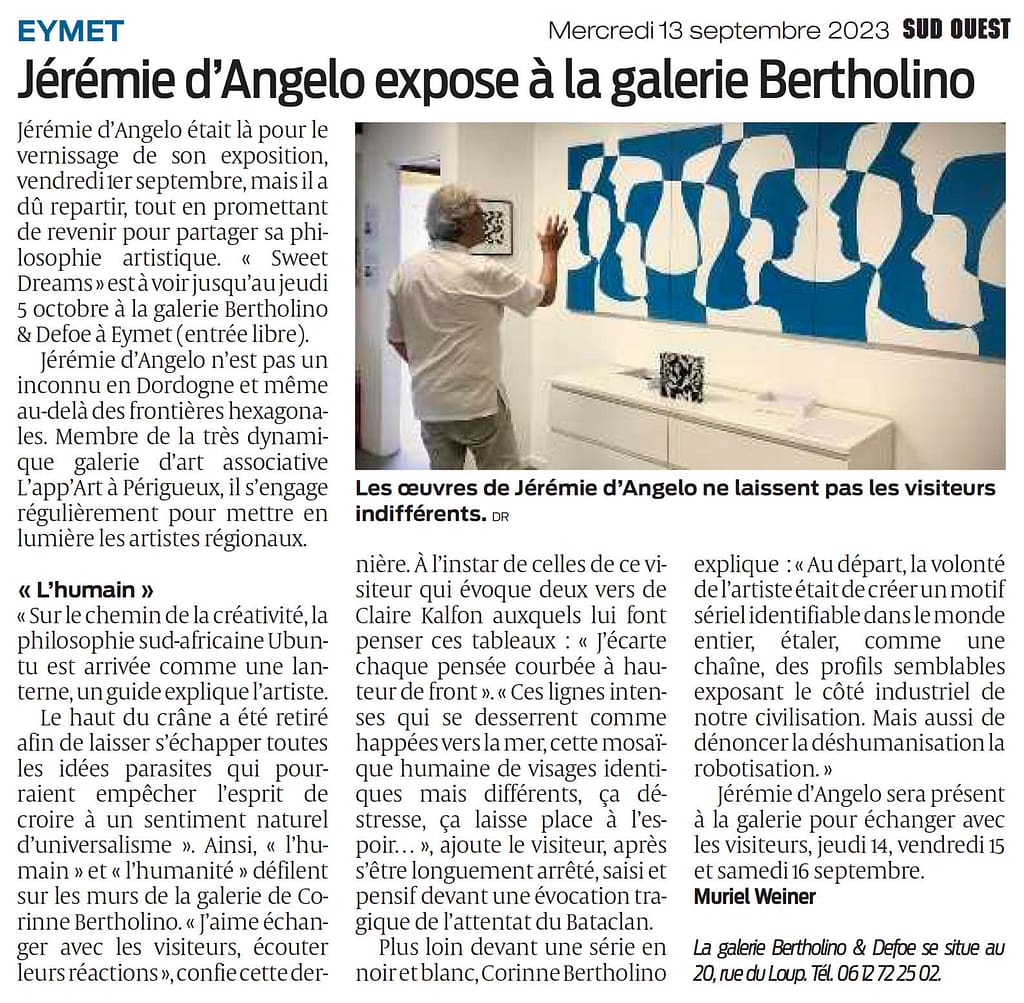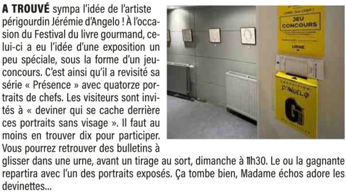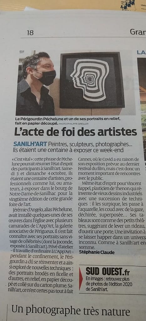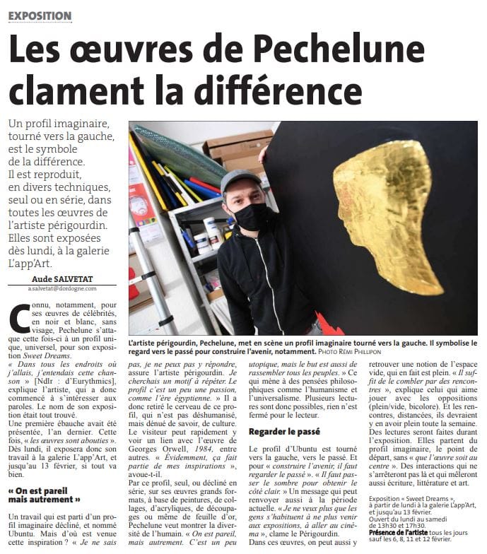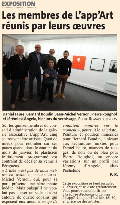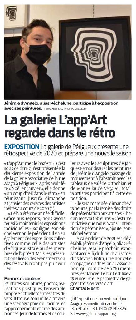 “En ce début d’année, la galerie L’app’Art de Périgueux (Dordogne) réunit une sélection d’œuvres des artistes accueillis en 2021. 12 expositions ont été organisées l’an dernier. Peintures, sculptures, dessins, créations graphiques, la palette se caractérise par une variété d’expressions, entre habitués des lieux comme Jérémie d’Angelo ou Daniel Faure et nouveaux venus.” Article en ligne : cliquer ici
