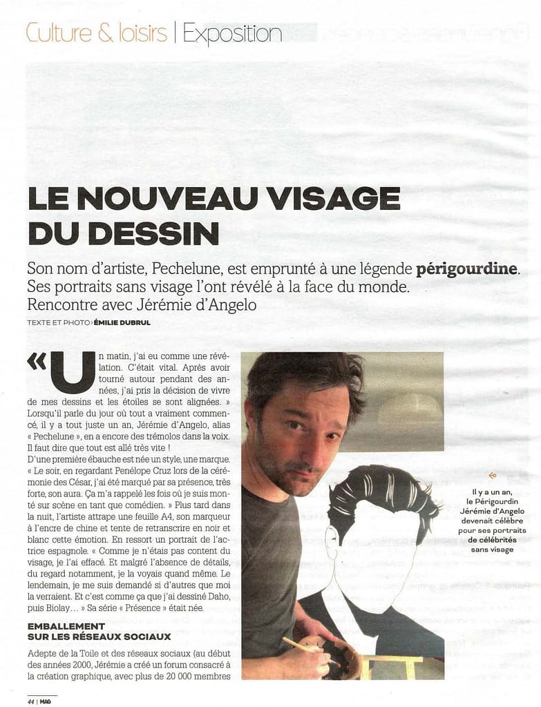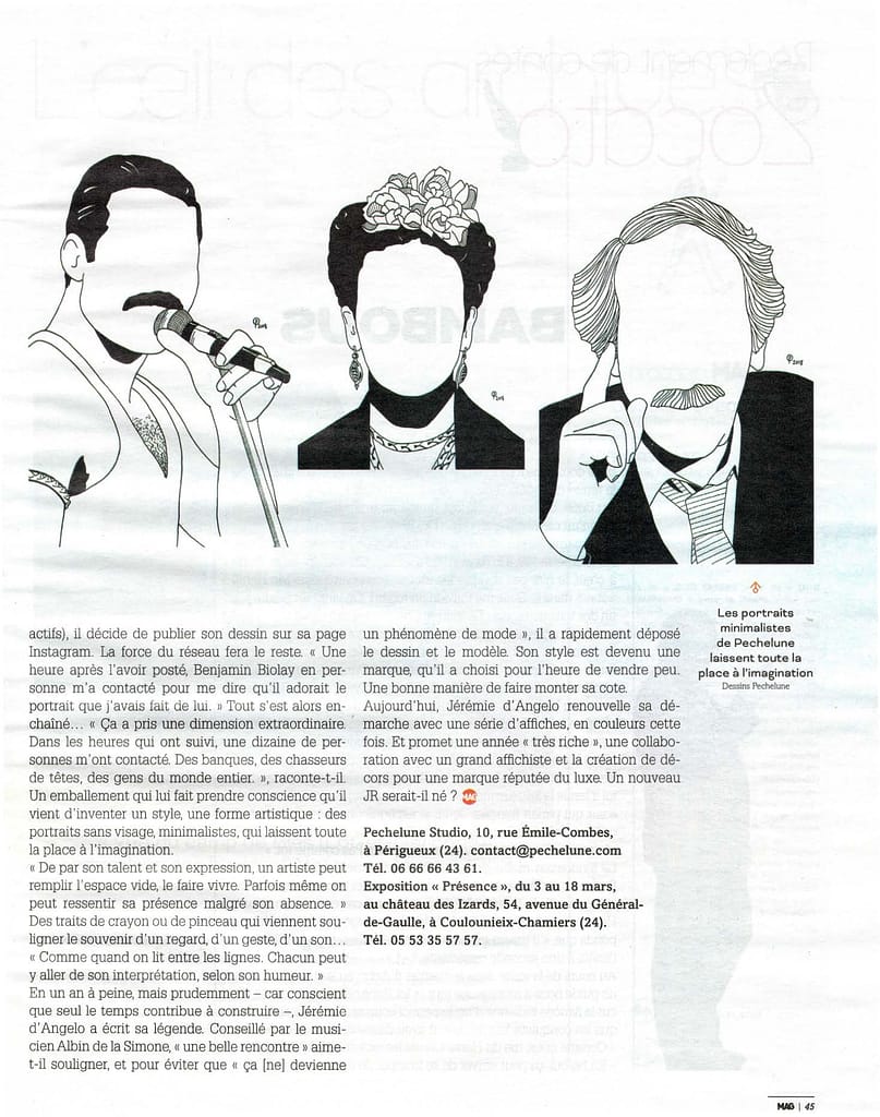 Des portraits de stars dessinés… sans visage. C’est le principe de “Présence”, un projet artistique initié par Jérémie d’Angelo alias Pechelune. Ce dessinateur immortalise les gens connus en occultant les détails de leur visage. Une omission qui permet malgré tout d’identifier la plupart d’entre eux. L’idée a séduit le public et les célébrités représentées. 𓅪
