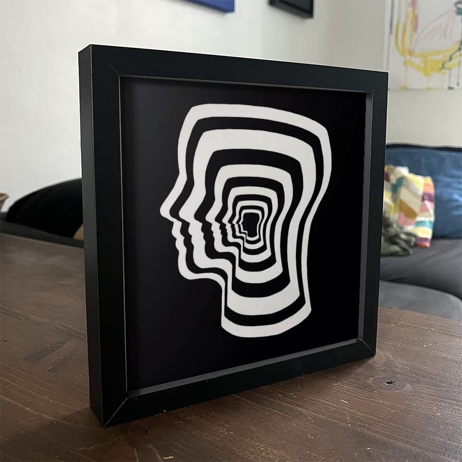 Encre de Chine et collage. 20x20cm dans un cadre alu 30x30cm. (ou 20x20cm dans un cadre 21x21cm) Livraison en 3 jours ouvrés ou retrait à l’atelier de l’artiste.