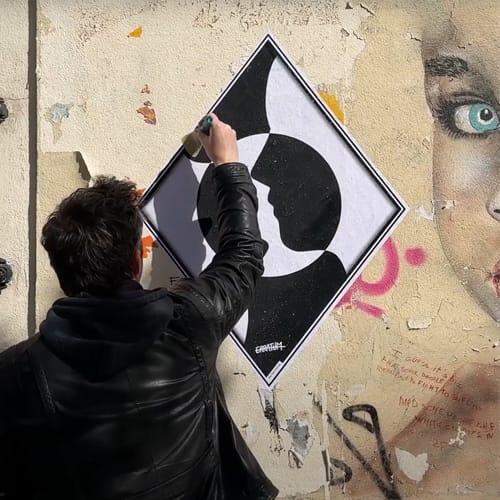 En 2021 Jérémie d’Angelo rencontre Ernest Pignon-Ernest à Paris, un échange très riche et de bons conseils qui vont l’inciter à découvrir activement le street-art. Depuis, ce sont plus de 500 collages rhombiques qui sont apparus sur les murs de la Butte au Cailles ou encore ceux de Belleville et de la Butte Montmartre à Paris. Mais aussi à Bordeaux, Le Havre, La Rochelle, Angoulême et Périgueux…